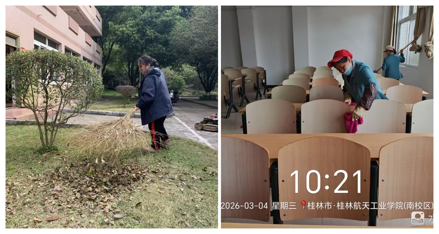 在校园环境整治中,物业科组织保洁人员开展 “全方位、无死角” 清洁行动,重点对教学楼、宿舍楼、图书馆等公共区域地面、楼梯、卫生间进行深度清扫,集中清理校园主干道、绿化带内垃圾杂物,同步完成公共区域消杀及花草树木修剪养护,校园面貌焕然一新。